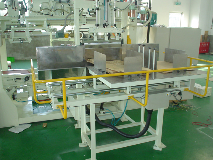 該自動上袋機完全模擬人工上袋的各個動作,首先將包裝袋放入集袋箱內(可放200只包裝袋),按起動按鈕,放置在包裝袋袋口上方的真空吸盤在氣缸的作用下快速下降,吸住^上方的包裝袋袋口上側,并捻起,此時真空吸盤由橫向氣缸帶動,帶著吸住的包裝袋向夾袋器方向約移出150mm。放置在包裝袋移出部分下側的各一對真空吸盤在底部氣缸的作用下上升并吸住包包裝袋袋口的下側,并向下一拉,該動作完成后,此包裝袋的袋口已完全打開,與此同時,上袋機的上袋臂插入袋口并拉緊,上袋臂由氣缸動作,后入的手臂一樣將包裝袋送入夾袋器內,夾袋器動作,將包裝袋夾住,完成自動上袋整個工藝過程。整個自動上袋機動作分明,就和人工套袋一樣,無多余動作,是替代人工上袋、減輕人員工作強度的更新換代產品,具有可靠性高、長期穩定性好、耐腐蝕等特點。