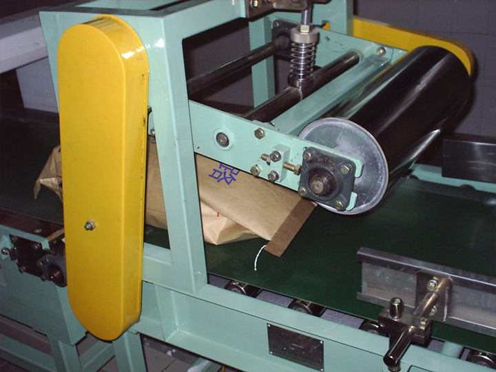 實袋通過壓袋輪和振動輸送機使之平整。利于自動碼垛。