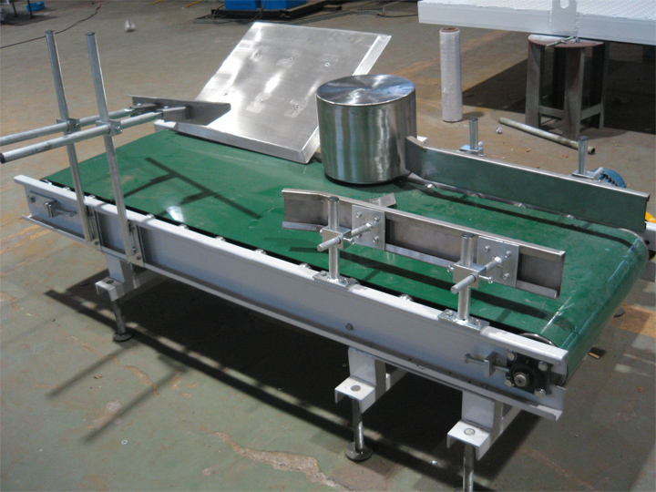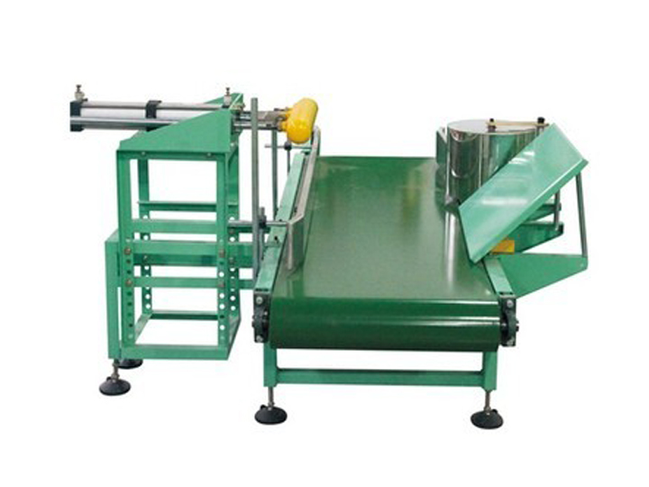 用檔桿、檔板組或滾輪檔板組倒包機構將包自動倒下,通過裝在輸送機一側的大圓滾筒將包水平理直,使成品包置于輸送機的中心位置進行水平輸送。一般機長為2.0m,帶寬500~600mm,機高500~700可調。倒袋單元由倒袋擋桿,倒袋輪和倒袋輸送機組成,以確保實袋平穩端正的倒包,進入下一單元。
